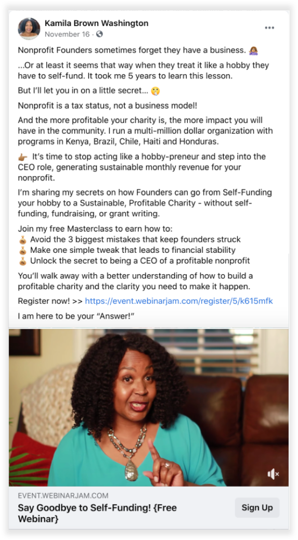 The ad copy was specific and to the point - clearly hitting the pain points that many nonprofit founders struggle with and positioning her masterclass as the solution.