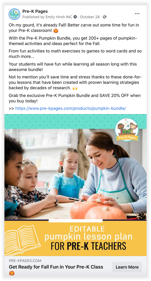 The client’s goal with this ad was to sell their Pre-K Pumpkin Bundle, a fall themed lesson plan for teachers and parents who homeschool.