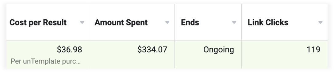 - UnTemplated Campaign: driving traffic to a sales page to promote our low-ticket ($49) UnTemplated course, with an Ads Magic ($67/month) upsell.
