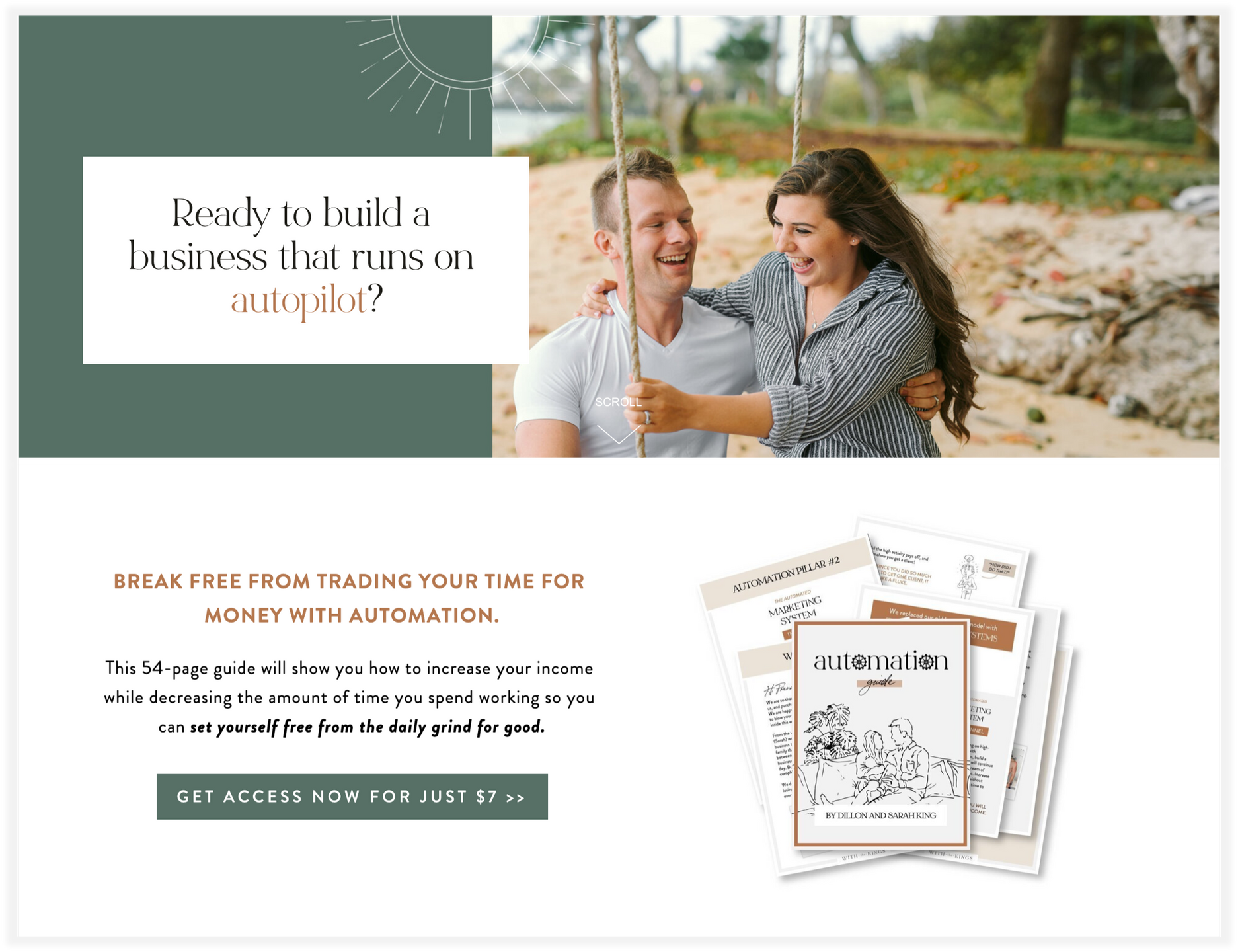 - Automation Guide Campaign: driving traffic to a sales page to promote our low-ticket ($7) Automation Guide, with an Ads Magic ($67/month) upsell.