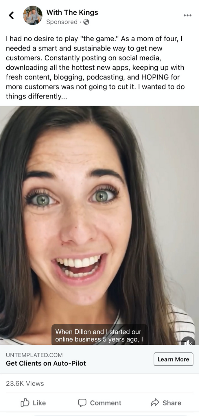 The goal of these ads were to drive traffic to our UnTemplated / Automation Guide sales pages to purchase for $49 / $7, then to the one click upsell for $67/month and then send all the new buyers through our evergreen funnel for the high-ticket Launch program. The strategy with both campaigns is to cover the cost of ads with the initial small product purchase so that any sales after that is pure profit.