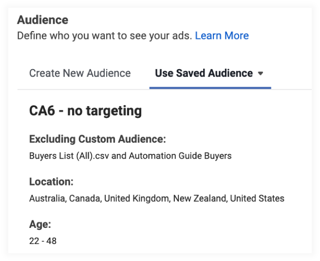 Over the past few months, we've been testing an audience with absolutely no interests or behaviors - just an age range and location (for english speaking countries). At first, I thought it was crazy to have an audience with no targeting (and it is), but I wanted to see how well Facebook could find new buyers just using the conversion history of my pixel.