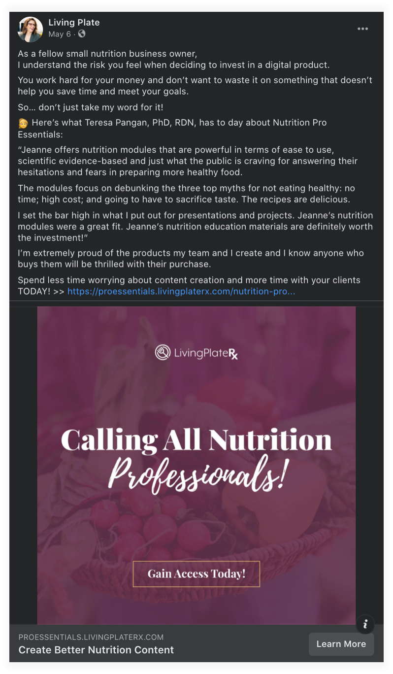 Additionally, the creative clearly calls out who this offer is for, ALL nutrition professionals, and hooks their attention right away.