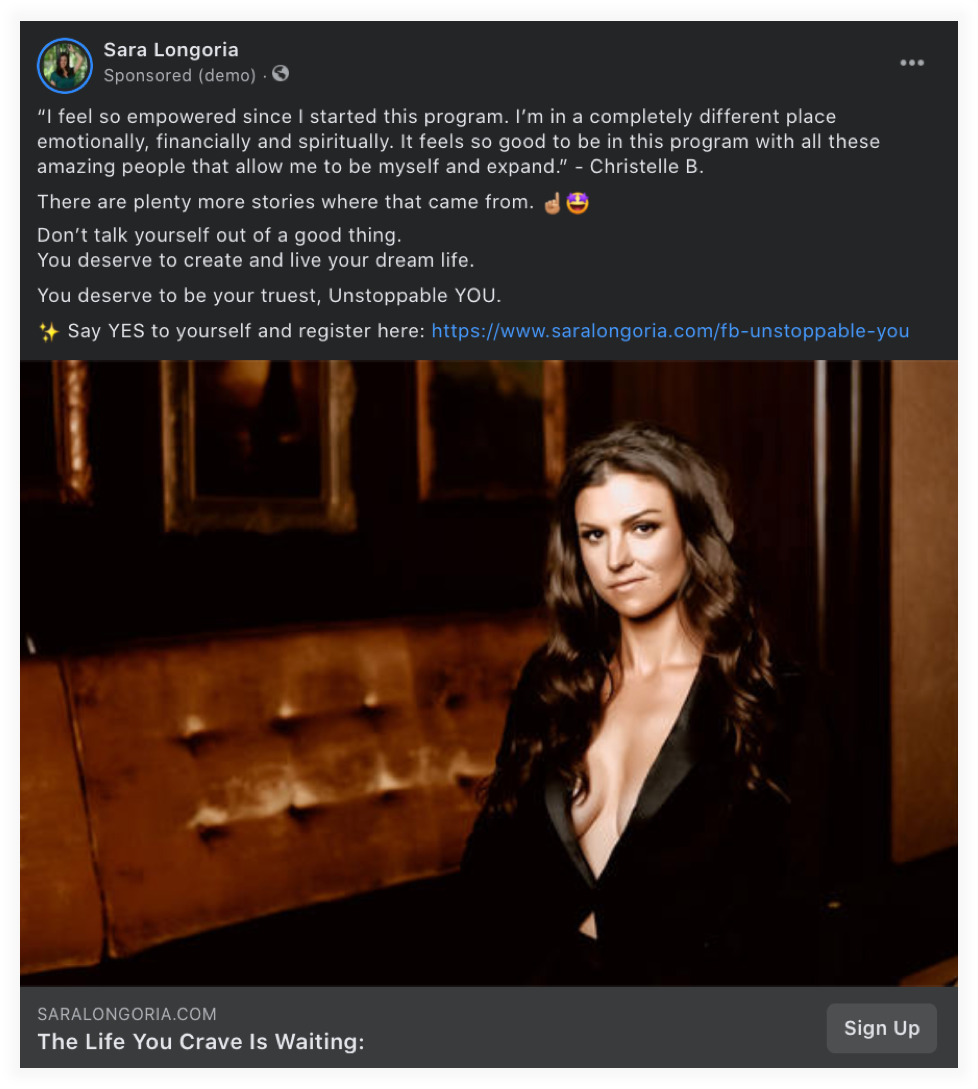 The copy is short form, with some versions using an enticing testimonial from a previous program participant, and always hitting on her audience’s pleasure point of finally being able to create the dream life they desire.