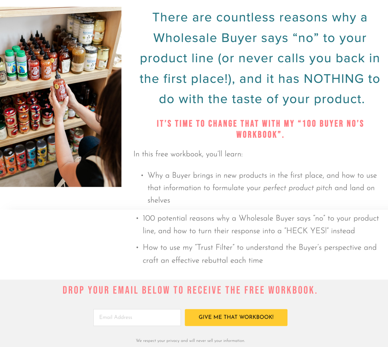 Allison knows her audience extremely well. One of their core problems is that they often hear “no” from grocery buyers when trying to place their products on store shelves.