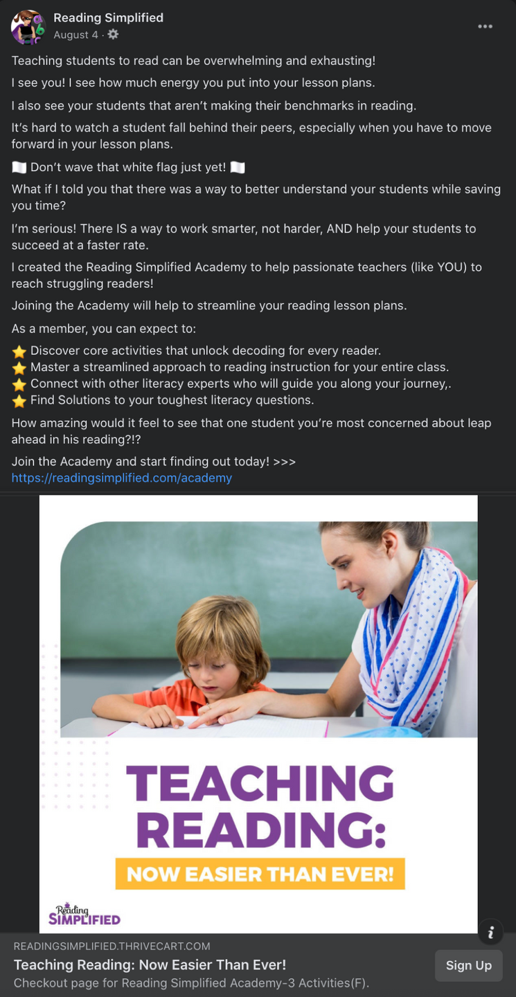 The goal was to sell the clients membership, Reading Simplifies Academy.